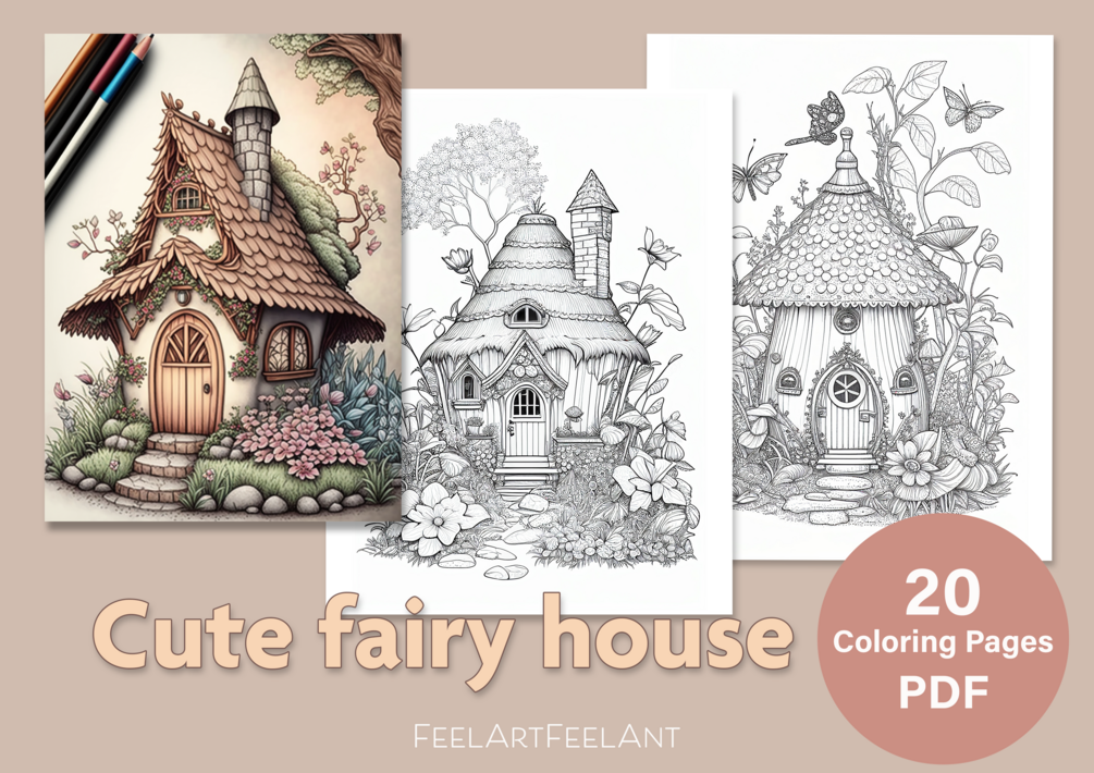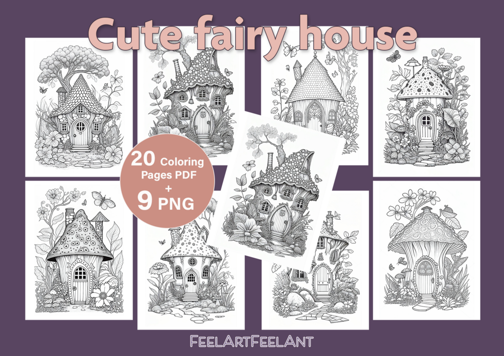 Cute Fairy Cottage Coloring Book 20 Images PDF + 9PNG - Kids Adult Coloring Pages