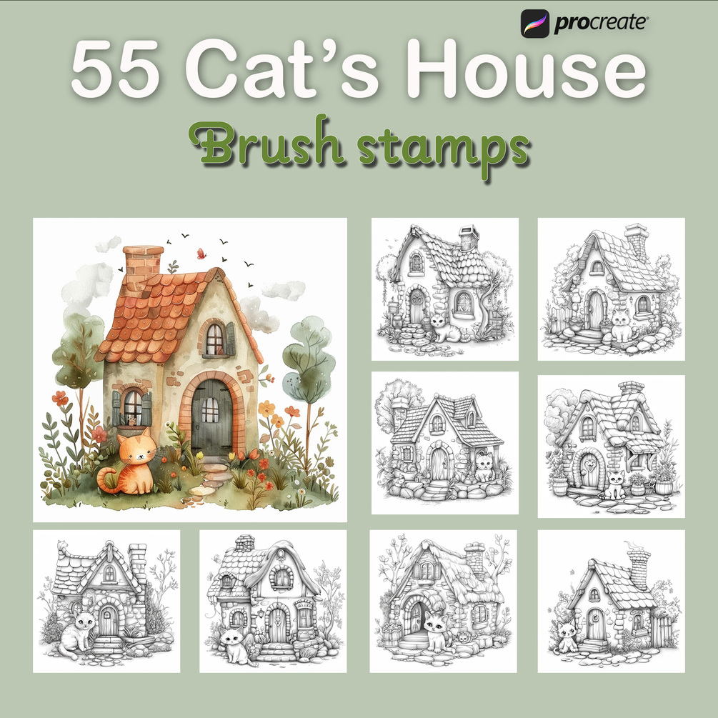 Available now for instant download on Etsy, bring the enchanting world of cat homes to your digital canvas with our 63 Cat's House Procreate Brush Stamps. Unleash your creativity and create a magical realm that tells a story with every detail!